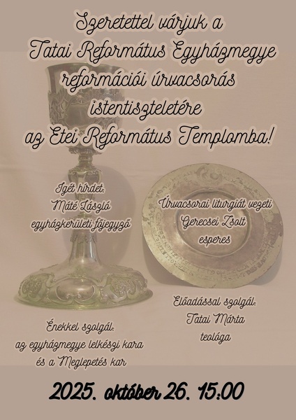 A 2025. október 26-án 15.00-kor kezdődő egyházmegyei reformációi istentiszteleten a az igehirdetés után előadás hangzik el, az ünneplő gyülekezet pedig első alkalommal úrvacsorai közösségben is részt vesz. Az istentisztelet plakátja ide kattintva érhető el.