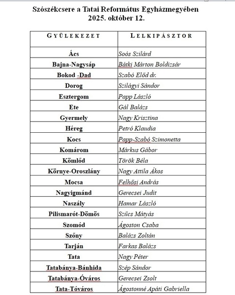 A Tatai Ref. Egyházmegye következő lelkészértekezlete 2025. szeptember 15-én hétfőn du. 16.00-tól lesz Nagyigmándon a megújult Gyülekezeti Házban.