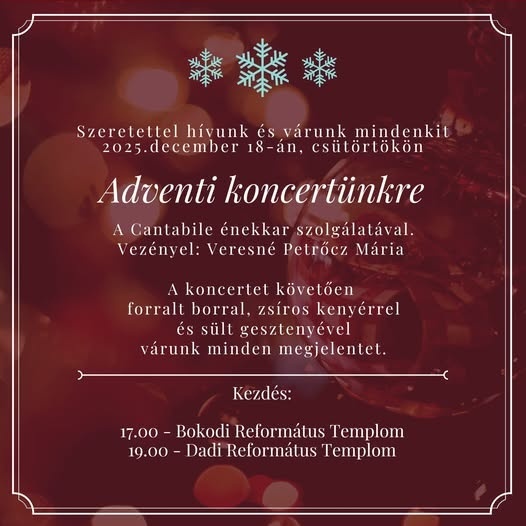 2025. december 14-én, Advent 3. vasárnapján 16.00-tól az etei ref. templomban Vadász Attila orgonahangversenyét hallgathatják meg az érdeklődők.