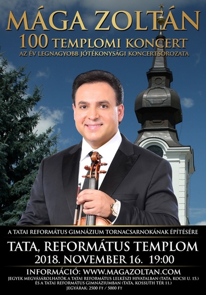 Mága Zoltán jótékonysági koncertjére 2018. november 16-án pénteken 19 órától kerül sor a Tatai Református Templomban, amelyen a Művész úr mellett közreműködik 25 tagú szimfonikus kamarazenekara is. A koncerten kizárólag előzetesen megvásárolt belépőjeggyel lehet részt venni!