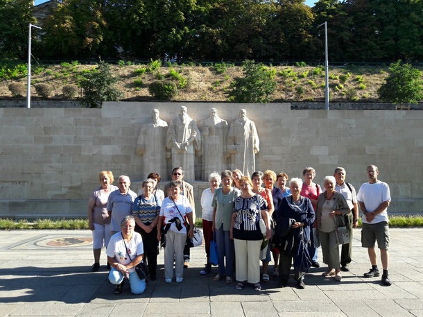 Így első napon az óváros legrégebbi lakóházában berendezett helytörténeti múzeum (MaisonTavel) kalauzolt el bennünket a reformáció tanait 1536-ban elfogadó város hétköznapjaiba. Egy 3D-s domborzati térképen láthattuk, hogy hogyan formálta a felszínt a jégkorszakból visszahúzódó jégtakaró kialakítva a mai látképet: a Genfi-tóból kifolyó Rhône folyóval. Itt láthattuk a Kálvin által alapított akadémia könyvtárának eredeti tartóoszlopait is. Ezen a napon néztük meg a „reformátorok falát". Négy szikár alak állt előttünk: Farel, Kálvin, Béza és Knox. Azonban mindannyian közös kőtömbön - lelki sziklán - álltak, melyre Jézus nevének görög rövidítését vésték a világosságot adó nappal együtt. Mellettük jobbra és balra Illyés Gyula mértékével 143 lépés szélességben a vallásszabadság védőit láttuk felsorakozni „kőbe meredten". Így a hajdúk vezérét Bocskai Istvánt is, aki 1606-ban megkötött bécsi békében biztosította magyar protestánsok vallásszabadságát.
