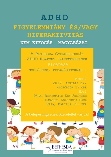 A Bethesda Gyermekkórház ADHD Központjának szekemberei tartanak előadást 2017. április 27-én csütörtökön 17.00-tól Pápán az Immánuel református Közösségi Házban: Figyelemhiány és / vagy hiperaktivitás - Nem kifogás. Magyarázat címmel.
