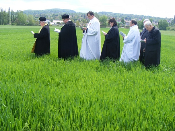 A Himnusz közös éneklésével kezdődött a szertartás. Majd az egyházak képviselői, egymás mellett vonalban állva, majd a négy égtáj felé fordulva kértek áldást a termésre.(A fotón, észak felé fordulva mondják a könyörgést a papok és lelkészek).A katolikus egyház nevében dr. Harmai László katolikus plébános, a református egyház részéről Ágoston Csaba lelkész, az evangélikusok részéről Klimentné Ferenczi Andrea lelkész, a görög katolikus egyházat képviselve, Cselényi István paróchus, mondott imát és szentelte, áldotta meg a búzatáblát. Észak felé Szent Lukács könyvéből, keleti irányba Szent Márk könyvéből, déli irányba Szent Máté könyvéből, nyugat irányba Szent János könyvéből vett igékkel kérték az Isten áldását, az új kenyér alapját szolgáló vetésre, a majdani termésre és az egész évi munkára.
