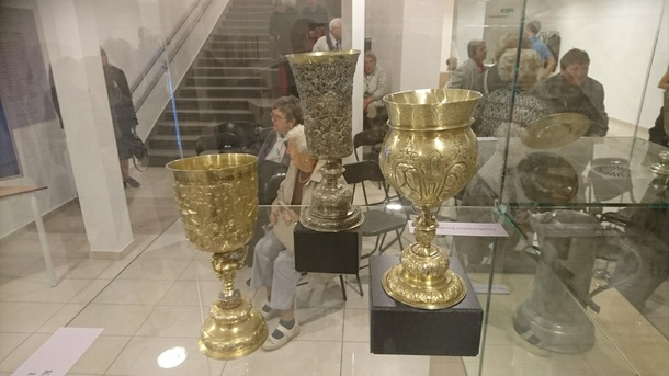 Láthatóak a „szegények ezüstjéből", az ónból készült: kenyérosztó tányérok, keresztelési kiöntők, úrvacsorai kancsók és itt vannak az aranyozott kelyhek, amelyek a jobb időkről, a módosabb életről szólnak.
