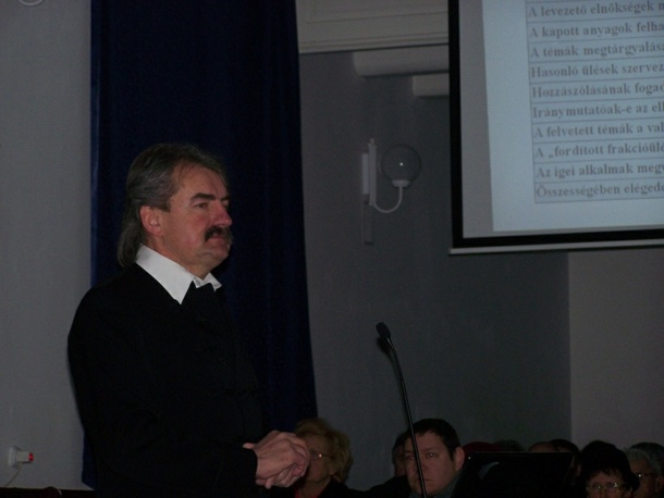 Az első előadó Szűcs Attila, zsinati tanácsos előadásának címe: Tennivalók a presbiter szemével volt. Előadásában elmondta, bár egyházunk megőrizte hitvallásbeli és szervezeti egységét, mégis rendkívül nagy problémaként említette, hogy csak az utóbbi tíz évben 50000 fővel csökkent egyházunk létszáma. A kiürülésnek kiüresedés is a következménye, ez viszont már nagyon komoly problémákat vet fel. Hangsúlyozta a stratégiakészítés szükségességét, hiszen szerinte ha nem tudjuk mit akarunk tenni, akkor nem is fogunk tenni semmit egyházunk megújítása érdekében. Az elmúlt időszakra utalva kiemelte, hogy az egyház belső okokból indíttatva sokkal kevesebbet ért el mint amit a külső körülmények lehetővé tettek volna. A beintegrálás nem sikerült, pedig a népszámlálási adatok birtokában a feladatok világosan látszódtak. Megítélése szerint sokszor nem hiteles a szolgálat, legyen az egyházunk bármely szintjén.