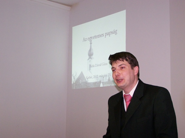 Bátki Dávid, etei lelkipásztor előadásában az egyetemes papságról, reformátusságunk egyik alappilléréről hallhattunk. Kiemelte, hogy minden hívő ember pap. Nekünk nincs szükség közbenjárókra, mi közvetlenül Krisztusnak tartozunk. Mi Krisztusért vagyunk Isten papjai. Nekünk az a feladatunk, hogy önmagunkat adjuk hálaáldozatul. Ezért tehát a legfontosabb, hogy mindenki a maga helyén elvégezze a tehetsége által elvégzendő feladatokat, de itt nincs kivétel azt el kell végezni.