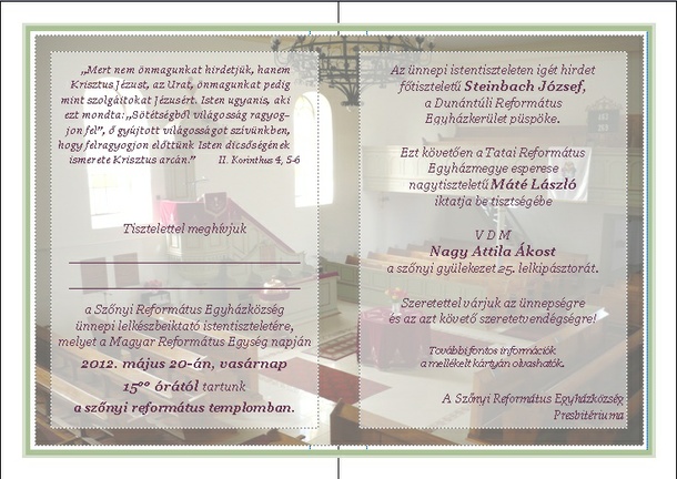 A Szőnyi Református Egyházközség ünnepi lelkészbeiktató istentiszteletét, a Magyar Református Egység napján 2012. május 20-án, vasárnap 15.00 órától tartja a szőnyi református templomban.